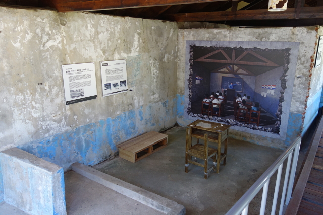 不過當年的房舍現在都被修復為展示館了,走進去,會先看到教室的示意擺設。