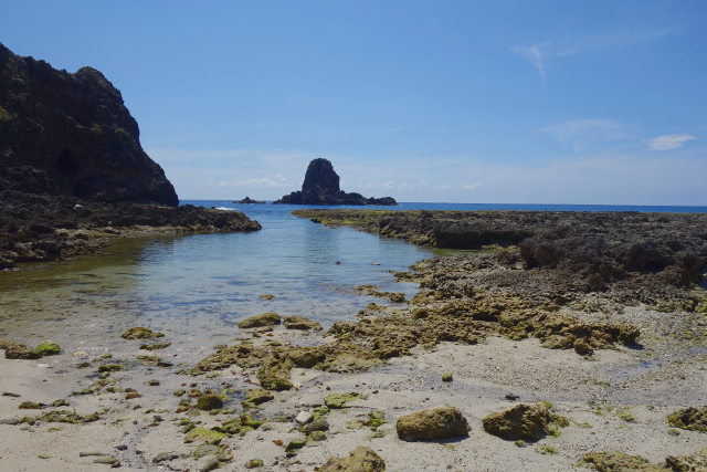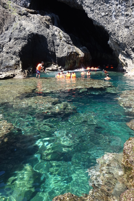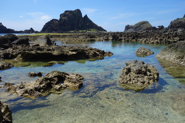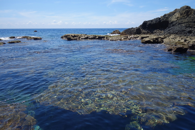 小心踩著礁岩走出洞,洞外淺灘水色清澈,望起來像是時間暫停的世界。