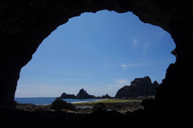 這個「彎弓洞」彷彿是個能窺望異世界的窗口,從昏暗中綻出青藍海天。