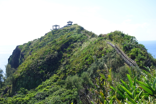 步道走到底,遠處丘岩形成逗趣的景緻,也就是在網路文章看過的「狗咬豬」,