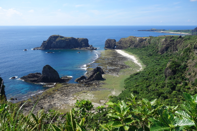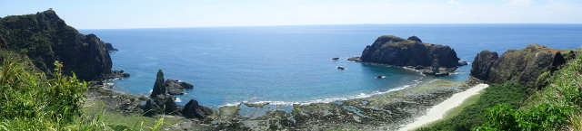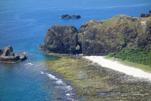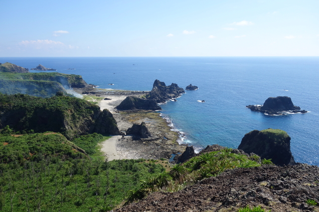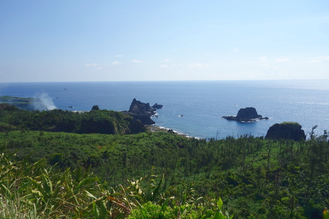 從朝日溫泉旁的山丘往下望,可以看到西側有處頗具變化的海岸地形,