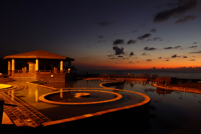 然後就是溫泉區囉,經過設計的弧狀泉區在微光下還滿美的,