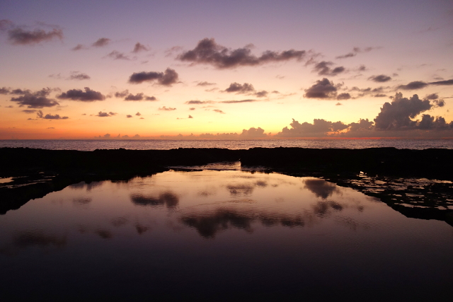 這樣的抉擇挺正確,因為走沒幾步,便見礁岩圍出鏡池,映射的橙黃光影很夢幻。