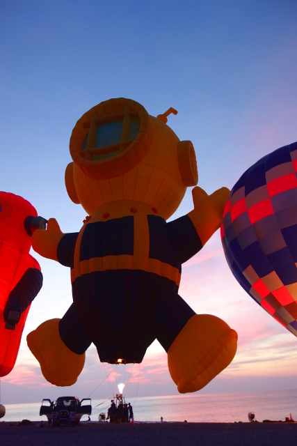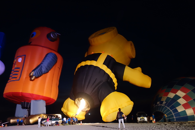 由於時候尚早,熱氣球們還在努力椪風,一點一點站起來。
