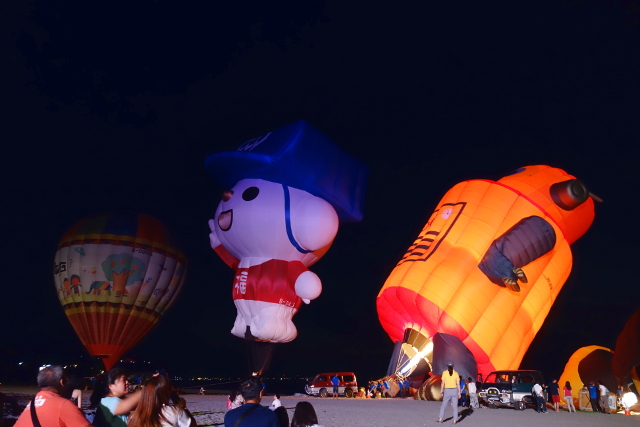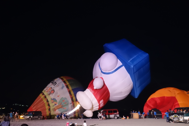 看了好一陣,總算五隻熱氣球都站起來了,大家輪流點火,紅通通。