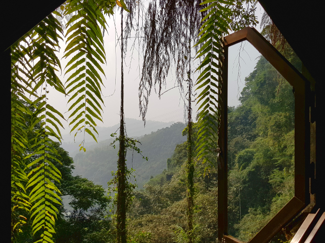 八角窗外同樣也是藤葉垂掛,霧茫茫的遠景讓視野多了些仙氣。
