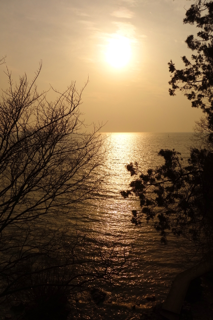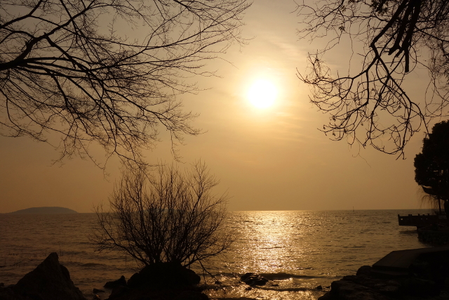 而在視野正前,溫黃的落日正一點一點投向湖光的懷抱。