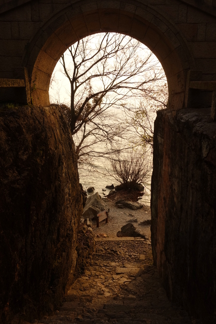 而岩隙修了石階,當一路往下,橋洞就成了景框,勾勒出此時的湖光夕輝,