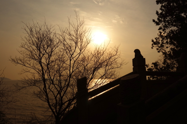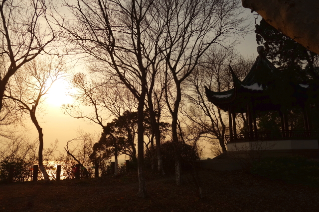 暮光將亭身烙出很棒的剪影,枝揚簷挑,隨便走望都是景畫。