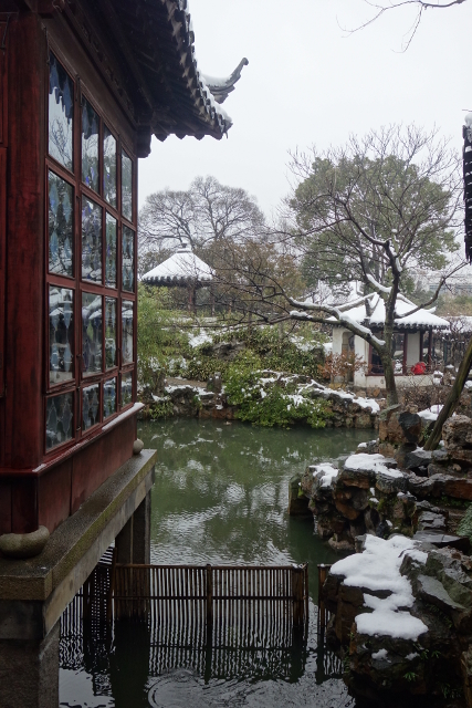 果然假山之上,不同造型的屋閣堆疊出峰巒,簷上的覆雪便像被冬寒染白了頭。