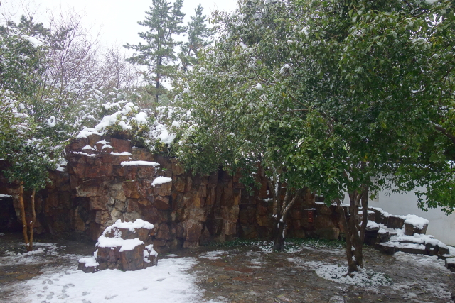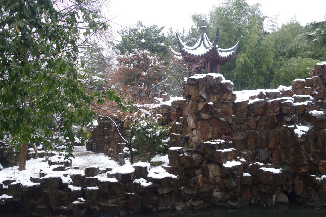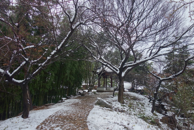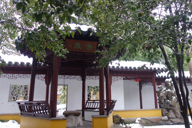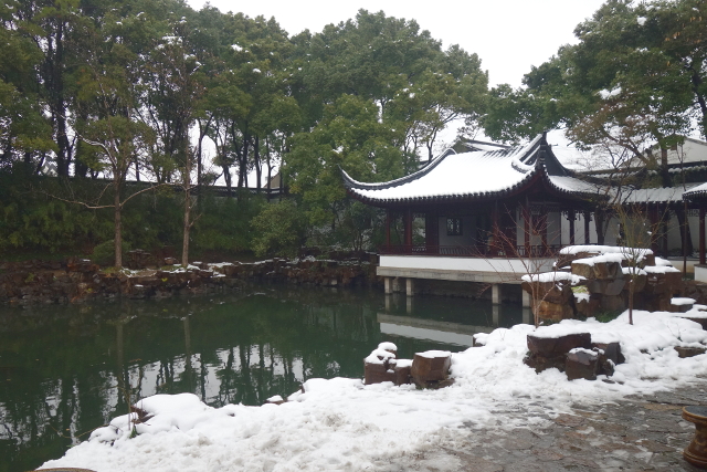 也沒花期更晚的一般梅,堆石水榭被白雪輕柔妝染,依舊推抹出很靜雅的圖繪。