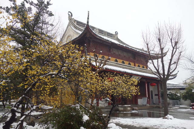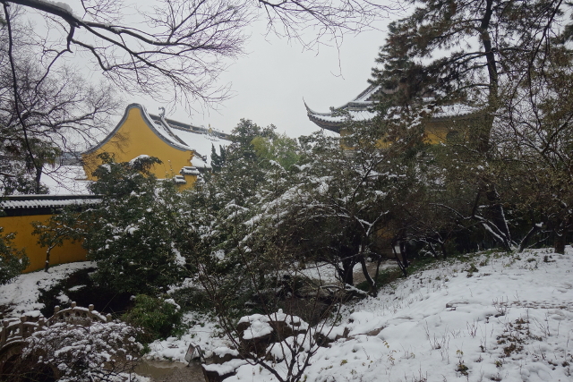 踏入中庭先看到的是很福態的彌勒佛,就算被雪積了一身依舊清涼打扮不覺冷,