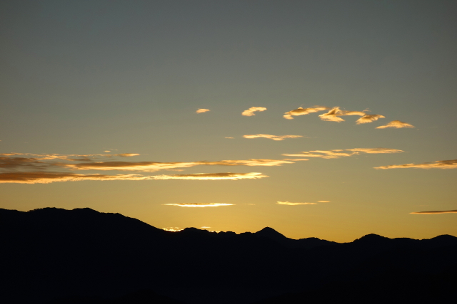 等呀等地,山頭的某一處顏色開始慢慢綻耀起來,將雲絮由橙紅輝亮成金黃。