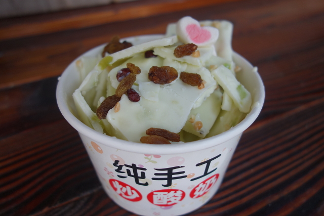 做完外國人的冰淇淋,老闆娘回頭把硬化在鐵板的冰切成薄片、灑上配料,盛碗端給我。
