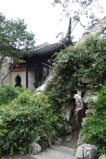 或許是為了應和它斜傾的角度,下方還搭襯了假山洞。
