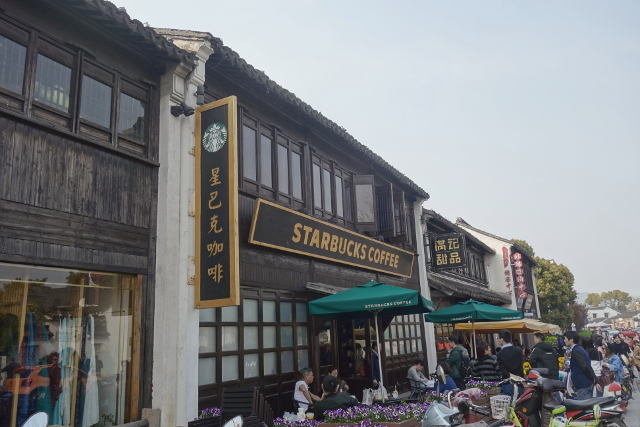 喝著飲料繼續往前,這邊的街區還有融入江南水鄉風格的星巴克。