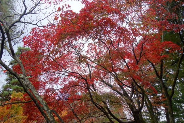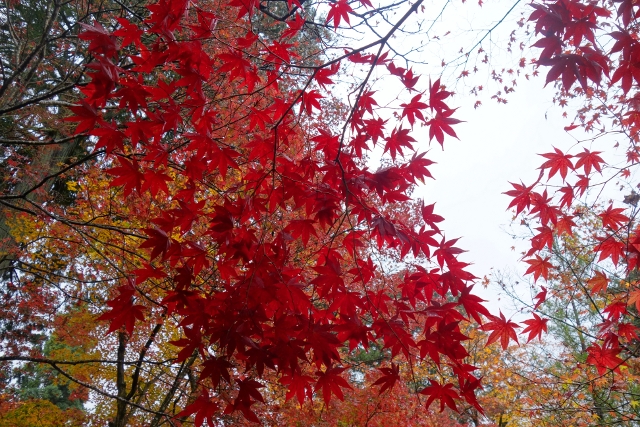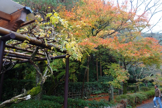 除此之外,有可能因「紅葉馬場」不若既往,抑或多數遊客還困縛於「常寂光寺」的景緻,來這兒觀訪的人眾不多,無聲山院裡,色彩的澄澈更加探印至心。而當雨後的微颸拂掠,紅豔掌葉顫動,似乎便是帶著暖意的笑容。我抬首迴望,不知不覺地,眼尾也隨之輕揚起來。