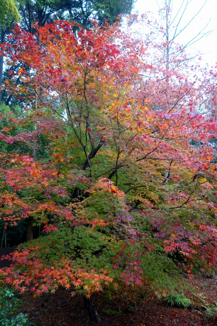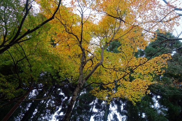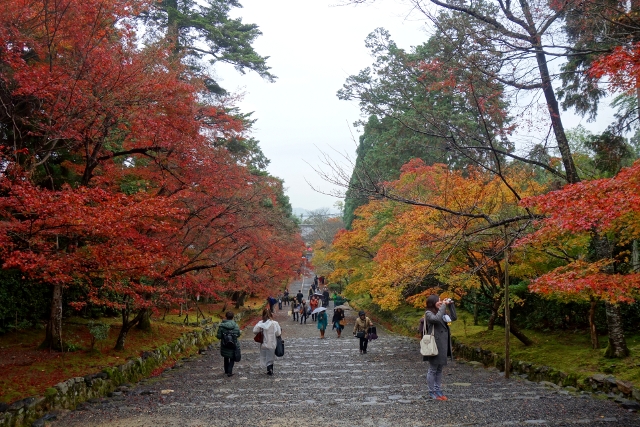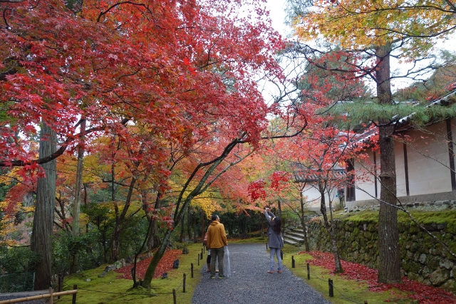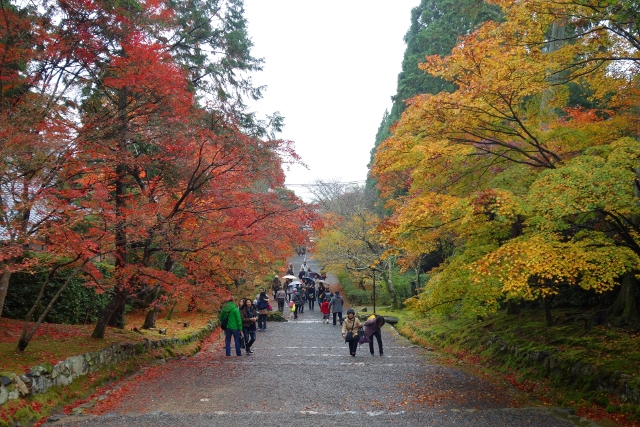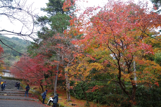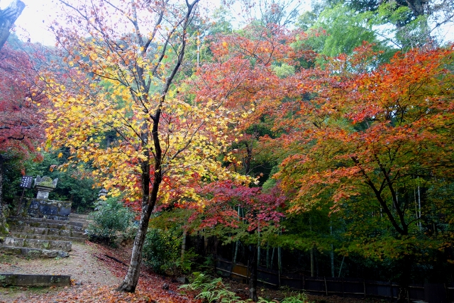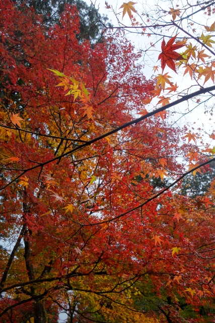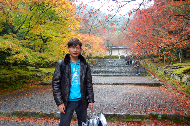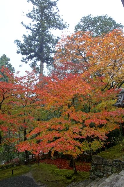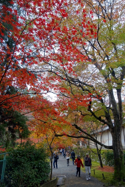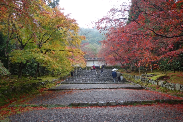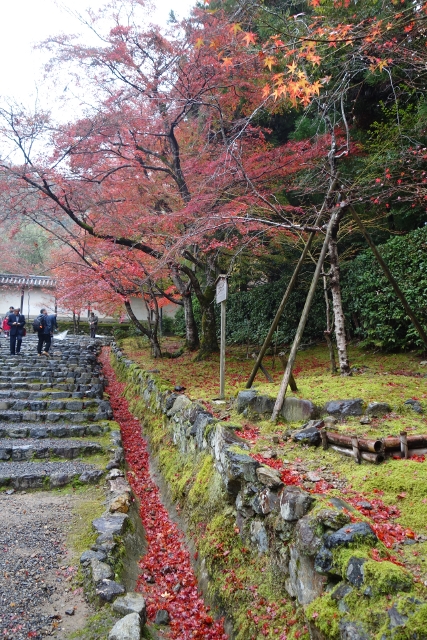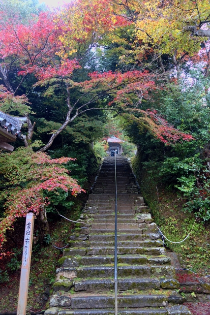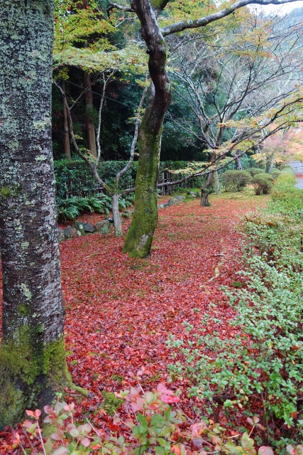 隨著步履前行,參道漸漸往旁拓展,開闊為一道層層上疊的緩階。我在階前停下腳步,因為根據事前的調查,這兒應就是讓此寺聞名的「紅葉馬場」,可是當視線往兩側一掃,心中卻生了狐疑,真的是這道階梯嗎?若從別人網誌得來的印象沒錯,眼前該是整片的嫣紅,滿盛至枝頭無法承受,於是被迫翩然散墜,將石階覆上一層豔麗妝彩。然或許是今年氣候令其尷尬,有一側仍堅持著翠碧,僅在末端綴了些斑黃,另一方雖進了褐紅之時,也難撐大局,因此飄葉僅落棲於樹底苔原,些許勉力染了階邊,離傳說中滿道楓彩的「紅葉馬場」,還有長遠的努力空間。