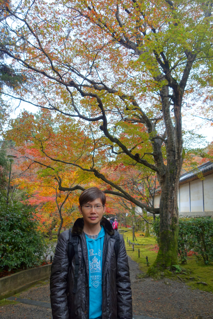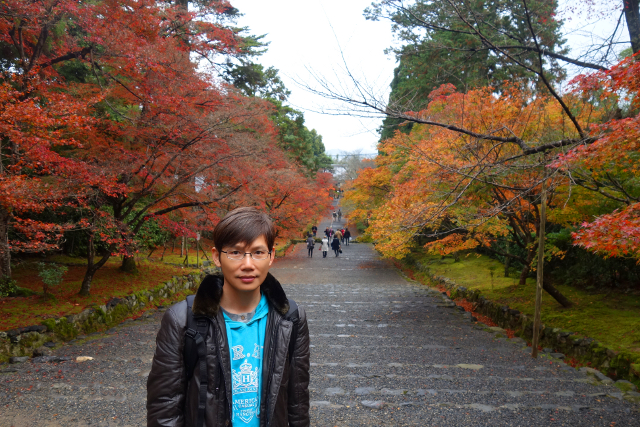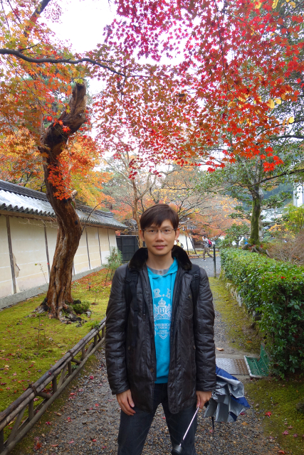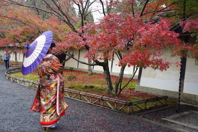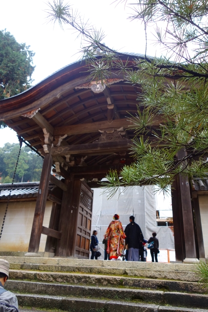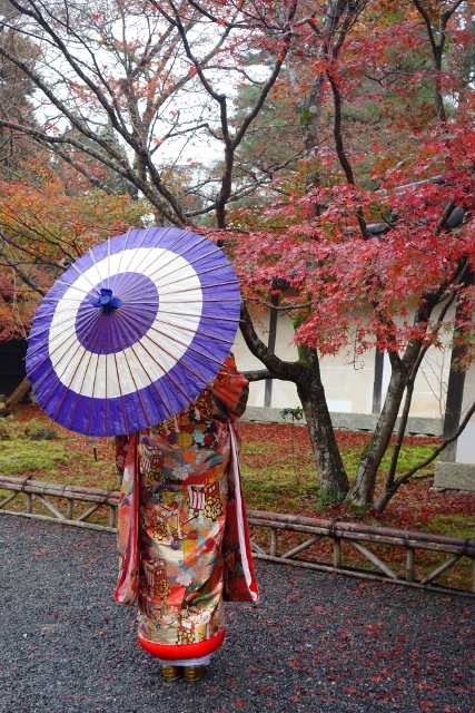 我好奇地跟了過去在人群後窺望,本以為遇上了哪位明星,結果是對新人,只是男生的衣著色調黯淡,所以沒什麼存在感。然這場面比較像婚紗照拍攝,畢竟女生穿的並非白無垢,而是紋繪極為繁複的厚重彩衣,貴氣轎輦與錦簇團花將袍袖綴得絢麗。這樣的服飾與寺裡楓景甚為搭襯,支著紫傘,隨意的回眸便是風情。妙的是她與YOYO台出身的蝴蝶姊姊極為酷似,我差點以為是什麼節目的特別拍攝,或是她背著狗仔,偷偷要嫁給日本郎了。