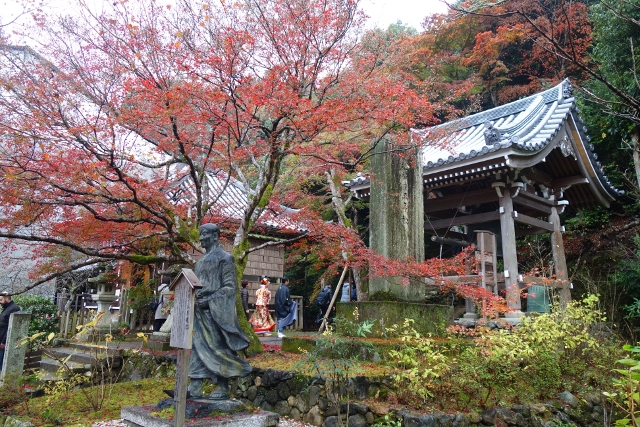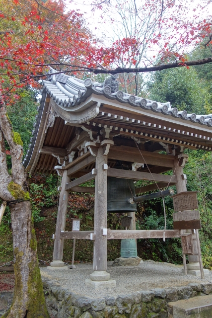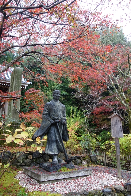 鐘樓前很奇異地成了片墓地,由標牌辨認,是在「江戶時期」開鑿了「大堰川」與「高瀨川」的富商「角倉了以」,身份似乎頗尊貴,後人還特地替他立了塑像。但不知為何,其眉眼深鎖,明明長眠於此應感三生有幸啊,這兒楓枝張展,探延的姿態相當優雅,加上葉色的紅豔正濃,若是我,即使雙眼已闔也會揚起嘴角吧。