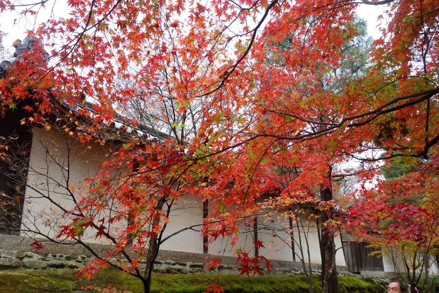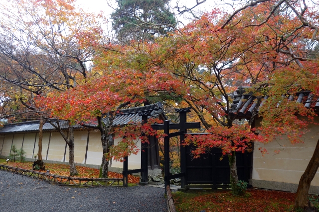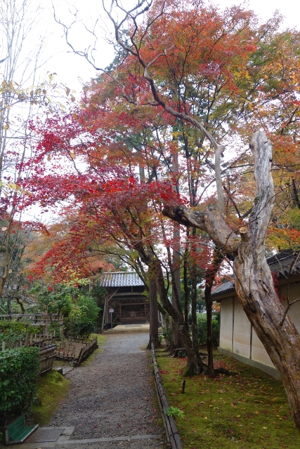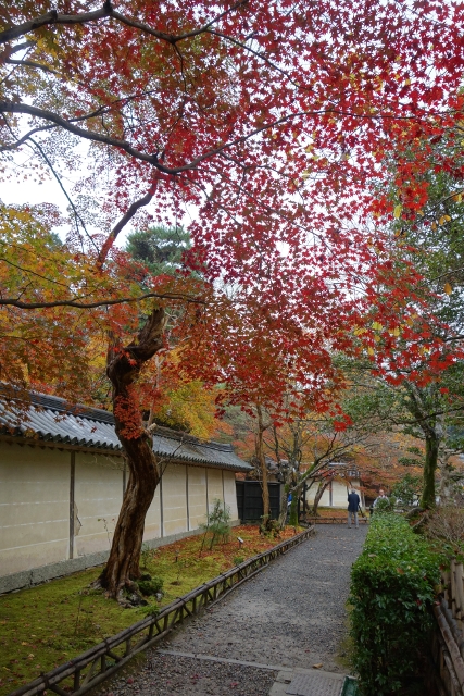 走到了寺院內牆,這兒的佈局令我有點不解,因為照以往概念,長階所指的方向應有座偉岸中門,但此寺卻像循著風水之理,避去直進之勢,僅在偏處開了個不具樓簷的墨色木架,名為「黑門」。不過這疑惑並未讓我思尋下去,畢竟牆前橫道楓色更勝馬場,是剛屆盛時的鮮紅,亮麗得讓我停步仰望。