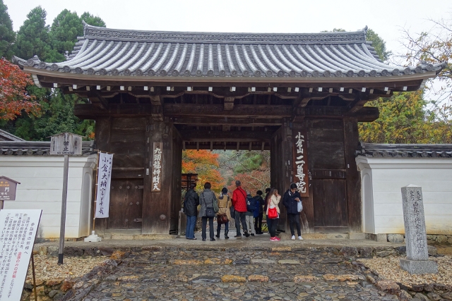根據指牌的導引,我朝北而行,下個要拜訪的點是「二尊院」,距離不算遠,走著走著便望見古樸總門張立在淨牆間。其柱板的木色墨深,感覺已浸染了無數時年的風霜,妙的是一邊牌額書著「九頭龍辨財天」,難道這女神在此地有著如此玄奇的化身?