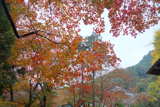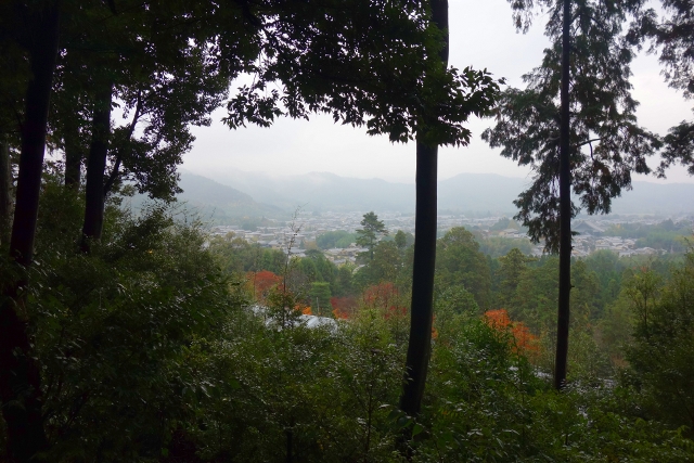 該說是運氣好還是運氣壞呢?當走出「常寂光寺」,從起床睜眼就一直陰灰的天幕終於飄起雨了,雖應對方才略晴的空檔心存感激,畢竟「常寂光寺」是今日最重要的景點,但我還有無數寺院待訪呢,何況走的大多是山路,若雨開始落得狂暴,腳下又泥濘,縱使沿途景色如畫,恐怕也得大打折扣。然老天似乎打算逗著我玩,雨絲就是這麼一陣陣飄著,偶爾歇了會兒,隨即又傾灑些,所以只能讓傘佔去一隻手,隨時備著。