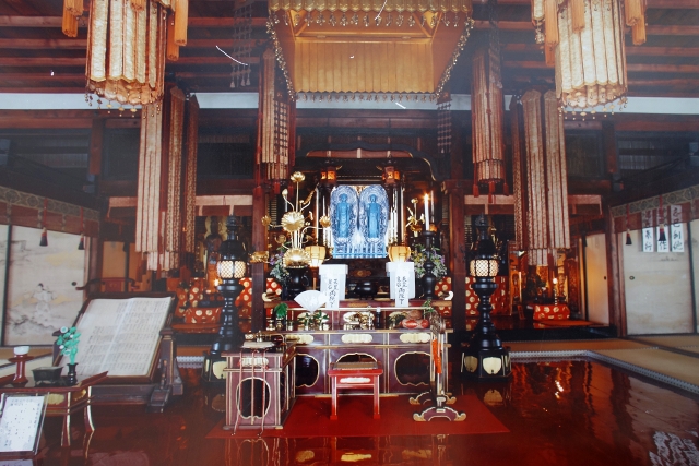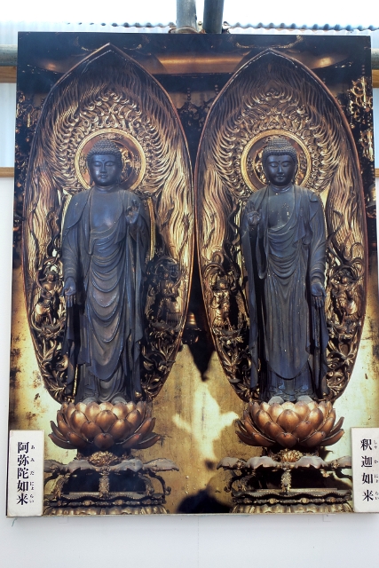 我端詳著照片,殿裡金燦華蓋高覆,周遭長幡懸垂,而在燈座瓶花之後的,是此寺名號來由的雙尊「釋迦如來」與「阿彌陀如來」。這間屬於「天台宗」的寺院起源相當早,可追溯至「平安時代」,但經歷了長時的荒廢與「應仁之亂」的戰火,直到五百年前才獲得再建。殿內同時併奉兩尊如來有其緣由,代表身處人世穢土的「釋迦如來」正勸說我們行往「阿彌陀如來」所在的淨土,所以他們也被敬稱為「發遣之釋迦」和「來迎之阿彌陀」。不過照片裡的雙尊宛若孿生,燄紋竄流的光背前,立於蓮座的他們面目祥和,能區別的僅有指掌的結印,在喚遣之間,助世人渡過苦劫。