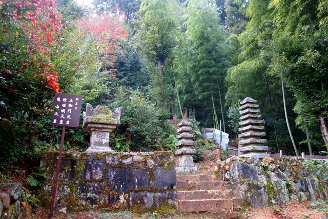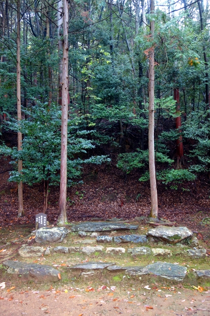 由此廟往偏處走,會行入一條荒遺山路,盡頭有片以石塊堆疊的台礎,背後還長了兩株高瘦樹木作依伴,相當微妙。這似曾有屋閣砌立之地被標為「時雨亭跡」,很令我生疑,畢竟「常寂光寺」也有塊同名碑石。不過這其實是歷史未解之謎,畢竟其主人「藤原定家」所在的時代古遠,學者們只能從蛛絲馬跡作推估,而現今歸納的位置有三,我走過的這兩個,以及等會兒也許會造訪的「厭離庵」。