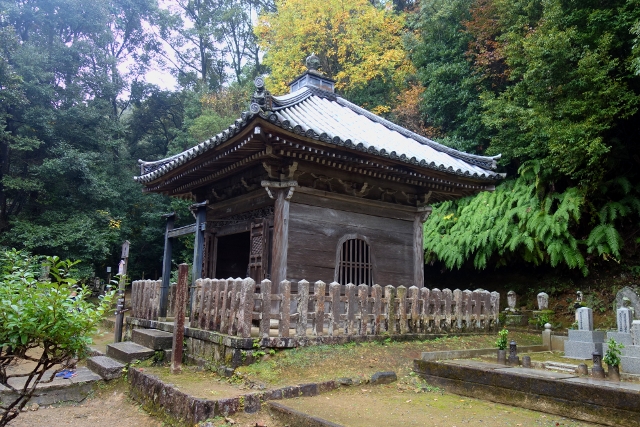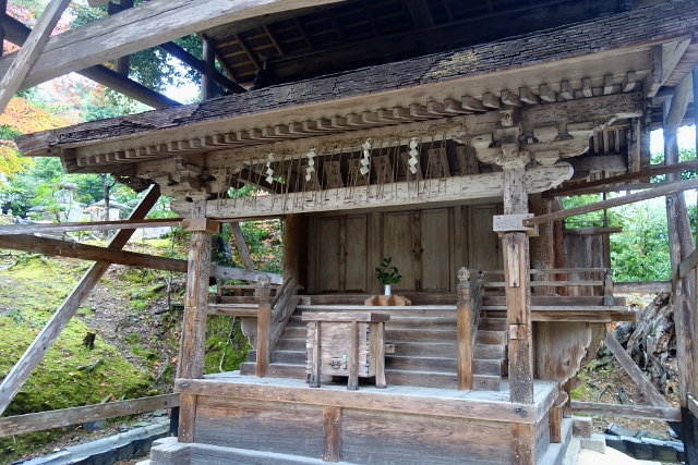 大致將寺院的平地區域走探過後,我把目光放至神社與鐘樓間的長階,根據地圖所示,上面是墓園,感覺不太適合遊客隨意觀覽,但想了想,只要帶著誠敬之心,應該不會太過冒犯吧。費了一番腳力,我爬到階頂,這兒有座「法然上人廟」,它築於「室町時代」,歷史價值頗為珍貴,儘管沉暗木色讓外觀看來隱晦,其實窗門樑栱間隱著雕琢,然這位上人是「淨土宗」的祖師,頗令人疑惑為何「天台宗」佛寺會祭著他的牌位?不過查了資料後得知,此院曾在「法然上人」的弟子「湛空」手中再興,或許這便是兩個宗派合融並處的契機吧。