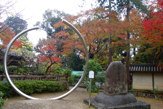 再往旁走,是被樹籬圍起的茶所,然雖這麼標著卻不見營業,似乎僅是片休憩區,此處的景緻頗微妙,樸褐棚架旁立了有著缺口的巨大鋼環,不知是象徵什麼的現代藝術。鋼環旁有石碑刻著「小倉餡發祥之地」,我自然無法知曉「小倉餡」有什麼獨特與美味,只是這樣的組合更令我疑惑,難道餡料與鋼環間也有不為人知的關聯?