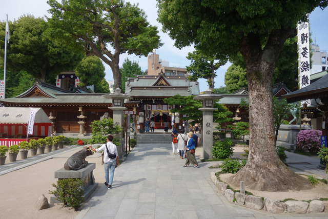 循街前行,再拐個彎,須臾就見「櫛田神社」現了身,相較多數神社以橙紅漆得喜慶,它比較像座廟宇,保留純樸的木質色澤,但石砌鳥居張揚,燈串左右掛懸,仍彰顯了「博多」總鎮守的氣勢。