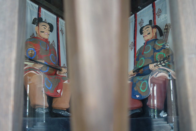 儘管解說文章洋洋灑灑,再望向作品仍對不太起來,那像是各佔山頭的諸將,有著統轄城池,每位都盔甲華麗,容形威武,所以…「黑田」是哪位呢?直覺是底部最顯明那尊,偏偏他戴著以雙蛇目裝飾的黑長帽頭盔,類似蓋「熊本城」的「加藤清正」裝扮。我把答案寄望於旅伴,結果他居然說:「字太多了,懶得看。」一付已將翻譯機反安裝的態勢,很值得給他白眼。既然如此,能憑藉的就只有文章提及的幾個姓氏跟作品武將旁的旗徽了,