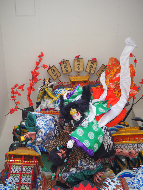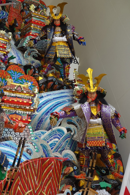 先望見的面向被標註為「見送」,所以是「山笠」的背側,但應是考量了於長街展示的觀者視線,豐富程度若稱其為正面,也不會有人懷疑。一座座立於牆垣的天守閣彷若疊巒,有浪花瀑流交襯,使用的色彩狂放繽紛,頂端宮牌如日芒綻射。散立的人物自是重點,很讓人聯想到布袋戲偶,每尊武將面相都有自我個性,袍甲層疊,盔飾張揚,衣飾綴滿了圖騰,毫無留白。