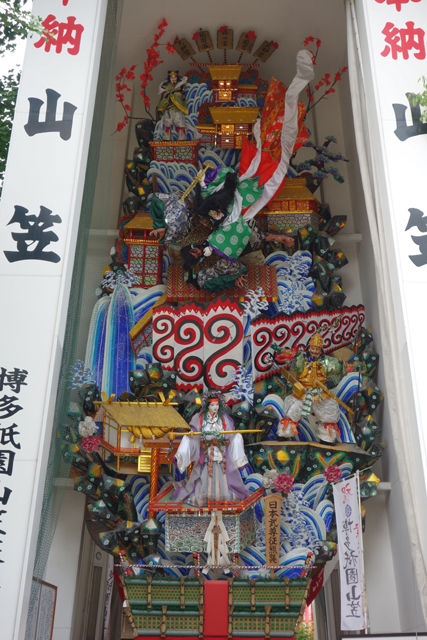 而穿著短掛與丁字褲,也就是「水法被」裝束的男魚人,就是對應另個更出名的「博多祇園山笠」了。這個祭典在七月,緣由自八百年前瘟疫蔓延,一位高僧被抬著沿街祈禱、遍灑聖水,漸漸地,就演變為華麗的扛轎遊行。然這兒扛的並非我們既有印象的神轎,而是得由數十人合力的巨偉「山笠」,一種以人偶造景堆疊達數層樓高,被稱作「飾山笠」,祭典期間會有十四座,擺於「福岡」街頭要點,供遊客居民欣賞,另種為「舁山笠」,雖小了點,多半只有一個人像主題,卻以賽事令人血脈賁張。