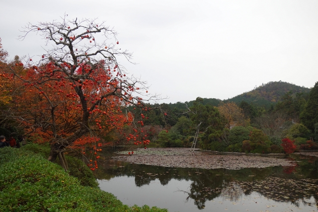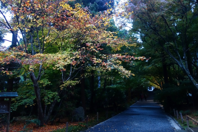 儘管少了水光的點綴,參道旁的楓樹依然絢美,單以自身的醺紅便牢牢勾住訪眾目光,我於前行中側首望著,不知不覺也走到了「鏡容池」對側。參道在這兒轉成平緩的寬階指著寺院「庫裡」,不過當瞥見一條小徑勾往池邊樹叢,還是忍不住繞了進去,想著就看個幾眼,滿足些好奇心,花不了多少時間。