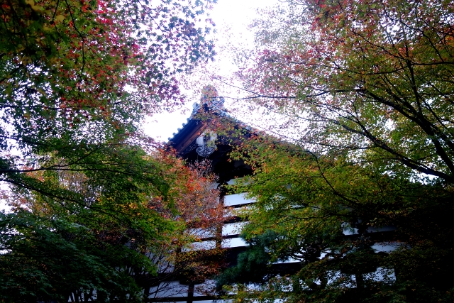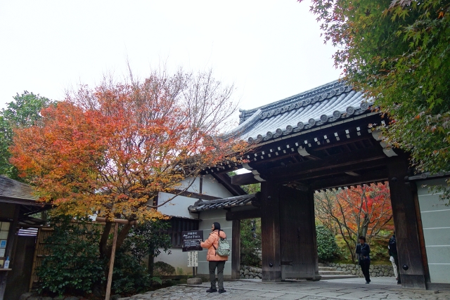 其簷下的牆色木褐,往旁串連的建物看不太清晰,畢竟茂密群樹自後探伸,掩去了周遭的人工築鑿,而一株楓樹在門旁俏立,黃燦轉朱豔的展揚葉姿很搏人好感。我在售票口付了錢,滿懷期待地踏入院內。