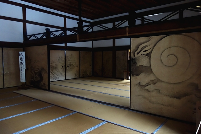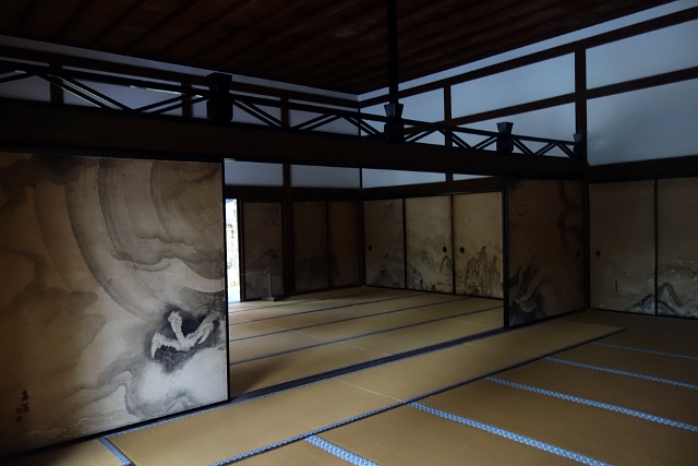 轉過頭,由於庭石的名氣過甚,「方丈」自身倒沒多少人在意,那裡頭的色調雅緻,米黃為底的襖繪上有筆觸飄渺的墨色山水。隔間的障壁被往旁推敞,讓光線自在穿透整個廳室,但也因此截去門板的部份圖繪,只能憑著旁現的龍爪與流雲,揣想閉合時的雲破龍顯之勢。