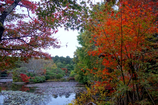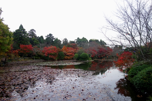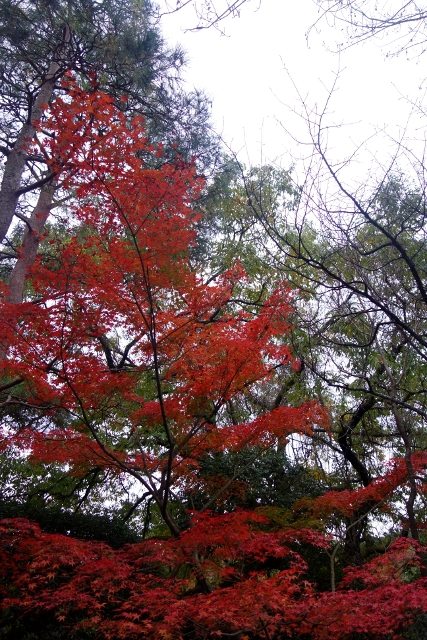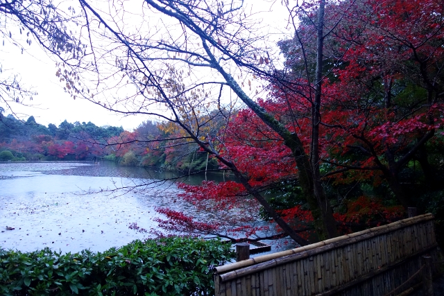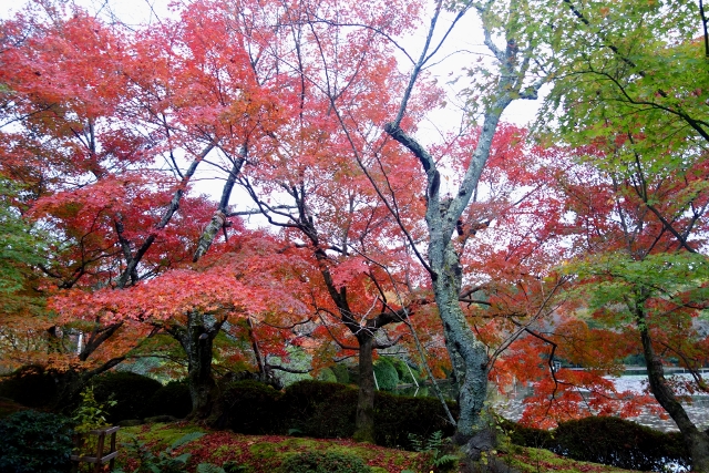果然,眼前的參道林樹交掩得蓊鬱,一側雖仍持著夏末延續的碧翠,另一方卻是楓紅綴抹,連土堤上的苔綠都被落楓侵漫,成了滿地的斑斕。根據地形圖的示意,參道位於側處,有岔路往旁包繞廣大的水池,而院裡主要的屋舍及著名的內庭皆座落在參道末。但見臨岸的楓姿如此華美,我還是不由自主先轉進了繞池的小路。