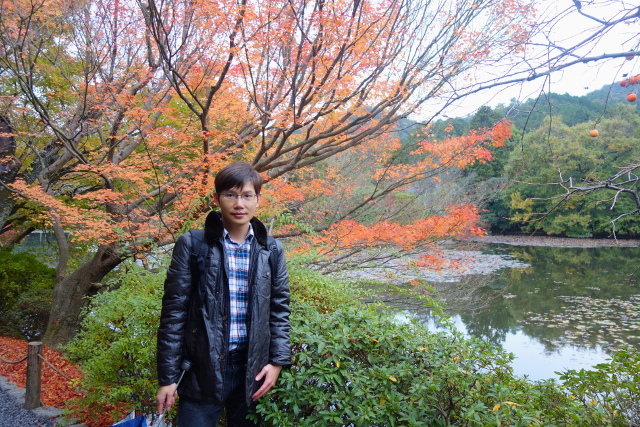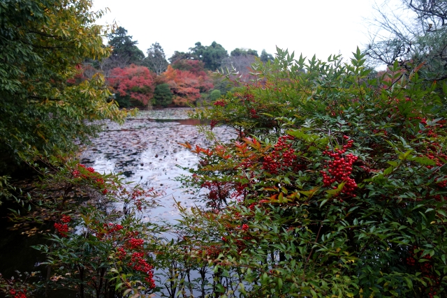 由這方向往前看,對處是參道旁的那片楓林,它連綿蔓延,連池影都因而熾灼,當中還有幾簇已成空枝的斑木,感覺若在這兒等到雪臨又去,眼前將會是素雅的櫻朵點飾著池岸。而假使再入了夏,便為池面與落楓漂聚的睡蓮主場,它們綻放著彩瓣,招來微風,拂去炎炎暑氣。
