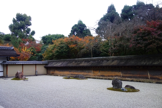 不過它的重建也來得很快,在兒子「細川政元」與第四代住持的協力下,寺院再度恢復了規模。我抬望著被設為入訪起始處的「庫裡」,其斜簷往兩旁撇捺出巨闊山牆,頗具門面氣勢。不過觀覽的重點不在此,得循廊再往裡走,「方丈」前的那片枯山水才是諸多訪眾欲細看之處。