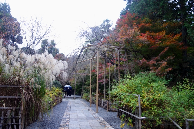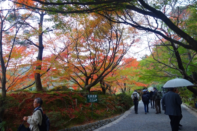 今日的天氣預報為陰雨,雖有幸於「永觀堂」見到陽光露臉,又撐過了在「真如堂」的正午時分,但當從「仁和寺御殿」走出,飄墜的綿雨已逼得我將傘掏出撐起了。想到晚上還有個挺重要的「永觀堂」夜楓,我不禁有點憂慮,假使真的大雨滂沱了,究竟該如何是好。然天氣的好壞再怎麼煩惱也於事無補,還是先完成眼下的「龍安寺」之行比較重要。