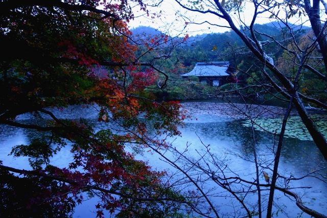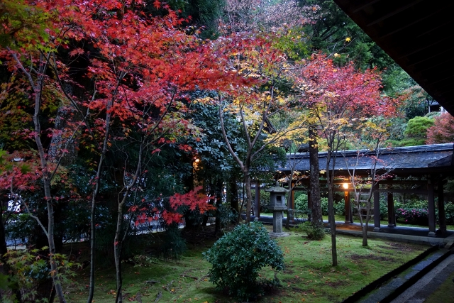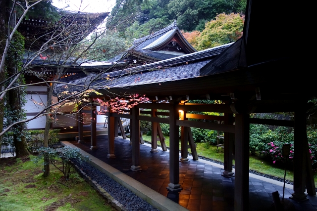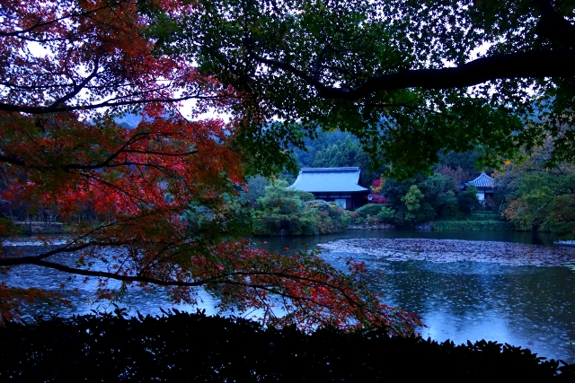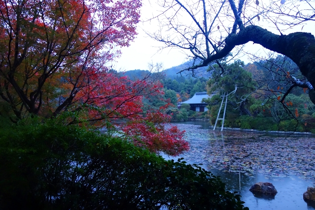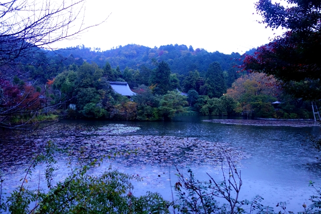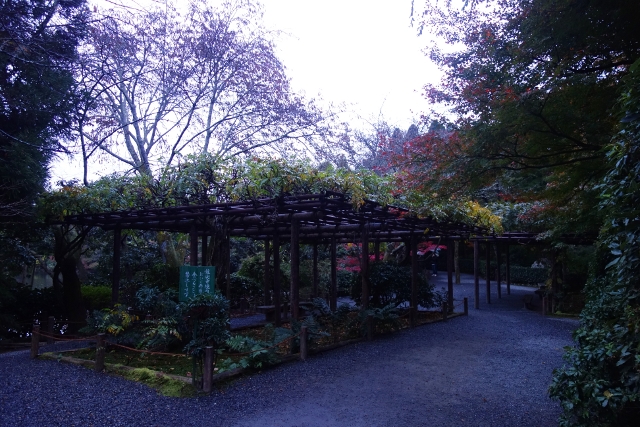 而當走過這藤棚,我便再次與池岸之景相見了,由於夜幕開始覆墜,此刻的水光已無來時的明艷,替之的是隨雨勢飄漫的愁鬱,連水面亦被擊亂得看不清倒影。但這樣的池色還是有其韻味,那些未能入訪的塔頭小院透了點簷脊,像在幽夜裡欲語還休,想跟我說些被史籍略去的隱晦故事。身旁的紅葉儘管黯淡了些,但輕盪的焰色還是傳遞了溫度,讓水氣不那麼沁冷,怔愣之間,便彷彿身邊多個伴,比肩相倚,心也踏實了。
