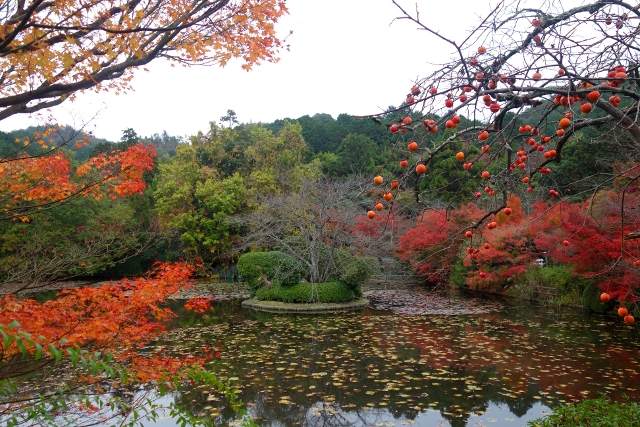 這樣的景畫在春夏已是滌心,秋意點起的楓火又令池岸更加多彩,明艷的色澤或於遠方簇點,或在身旁揚舞如笑顏,就連柿樹也搶了一席之地,探延出臂枒,讓橙亮的果球帶入圓融意象。當如此望著,心情亦隨之舒朗,就算有著什麼煩擾、隱著夾帶鬱結的傷疤,似乎都淡緲許多。