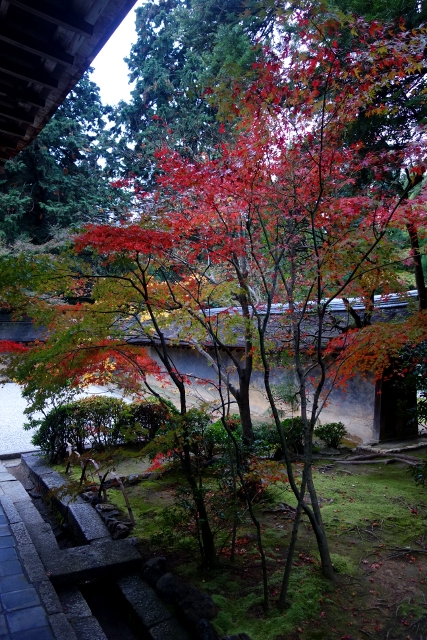 如此望著障壁畫朝「方丈」的側後繞去,週邊的景緻又轉了風貌,前庭的枯山水空寂,連牆外探首的枝林都略顯焦萎,這裡則以苔遍植,綠葉成蔭,幾株楓樹紅得極為豔麗。有一道敞廊往旁岔生,感覺若往那兒走還別有天地,卻阻著並未開放。比對了地圖,那區是「佛殿」所在,或許是為了僧人們的靜修,刻意劃出界線,將遊人的雜擾止於「方丈」吧。
