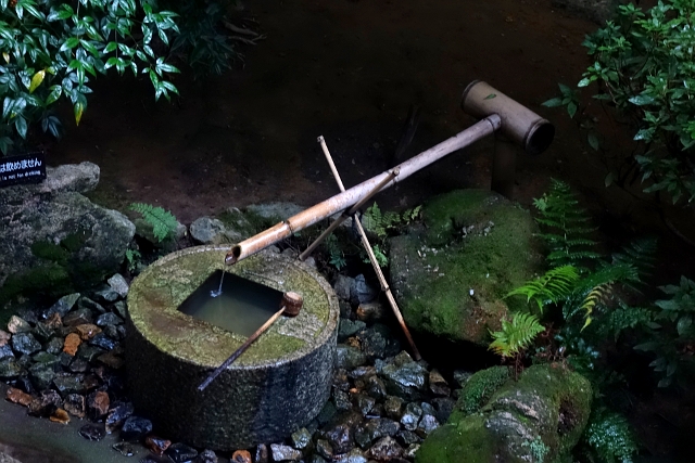 根據網路資訊,背處林子裡有個特別的水缽,但由於天色漸黑,眼殘的我還是問了寺務人員,回過頭才找到它的所在。石缽藉竹管引水盈溢,但重點並非水流輕墜的擊音,而是外圓內方的環邊刻了四字「五隹疋矢」,襯上中心的方口便成了「吾唯足知」,也就是中文「知足常樂」的意思。此為大家熟悉且明瞭的概念,但真能作到的有幾個?內心的欲求往往輕易便宰制了思維,讓我們無視亦不懂得珍惜身邊所有。儘管我也常跟自己說要澹泊,但對旅遊景點的執著應同樣是種貪妄吧。