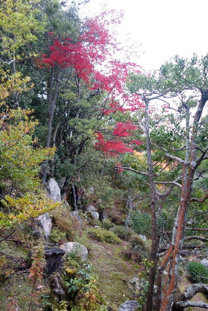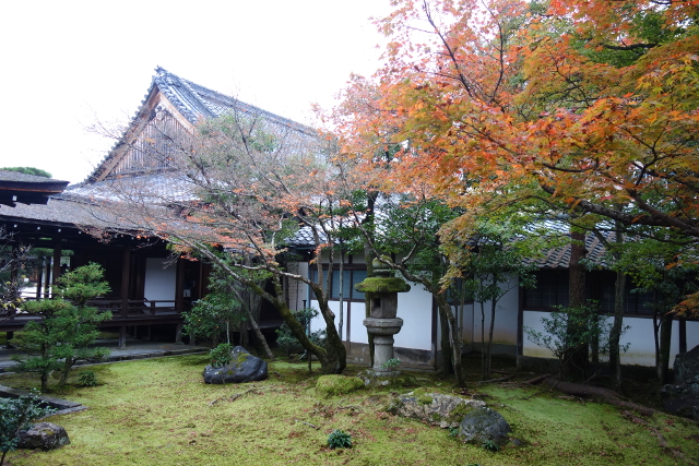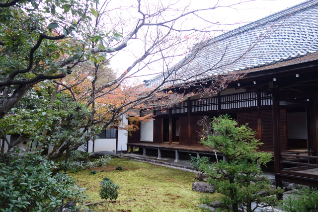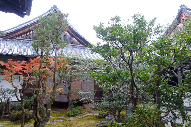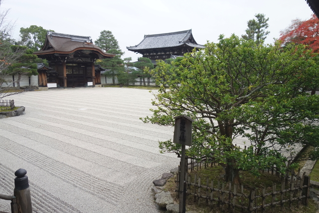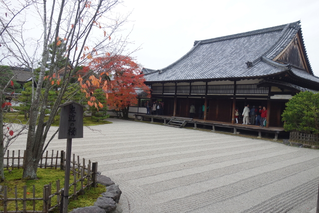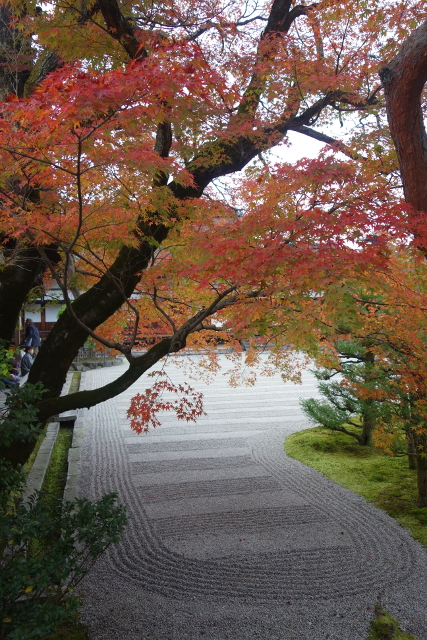 而當從廊下往外望,便是「敕使門」所通抵的「南庭」。其以枯山水佈局,顯得廣遼淨寂,沙紋並未刷理出常見的波弧環圈,僅用疏密相間的長帶鋪展,彷彿欲體現禪意中的空無與定靜。在這樣的反襯下,旁圍的林樹更為翠碧了,連幾簇孤生的楓枝都燃成一片焰海,將開始飄落雨絲的灰空點抹得燦耀。