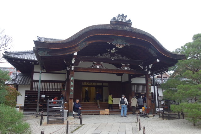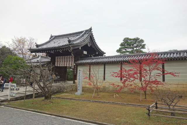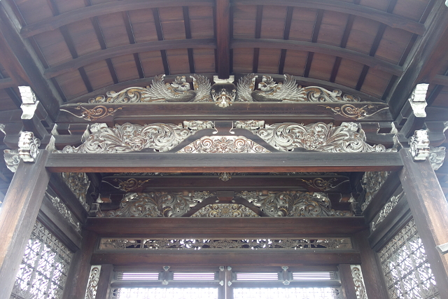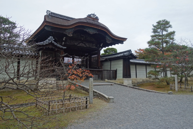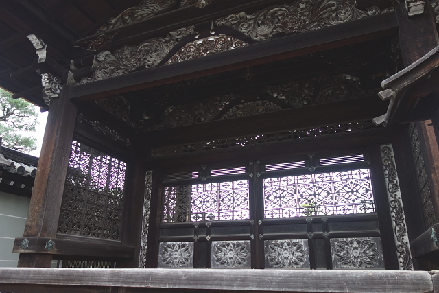 不過很可惜地,大部分建物都在「應仁之亂」中毀於火劫,還好主院於「江戶時代」得以再立,御殿區雖較晚,也有著百餘年歲。我順著外牆往南走,還未走至「本坊表門」,便遇上讓人不禁停步細看的「敕使門」。它雖是道門,卻佈滿窗花雕鏤,切分的細木框格間,團瓣被日光映透得繁麗。視線再往上,椼架間的額板先以昂揚鳳翼領首,而後如浪翻捲的花藤往內堆疊,彰顯此門為敕使而設的貴氣。