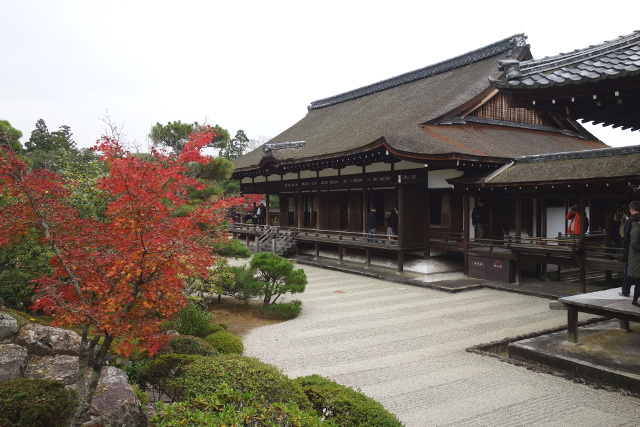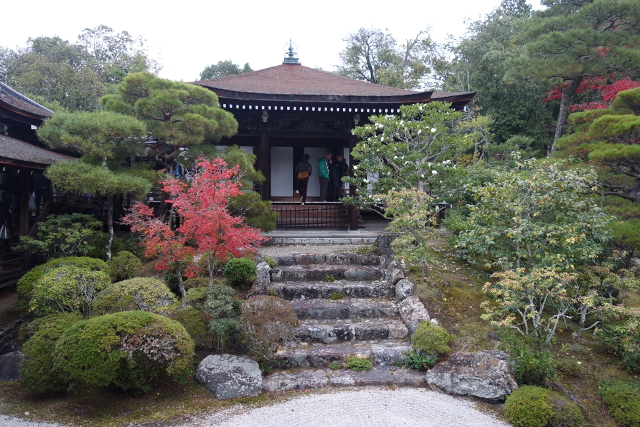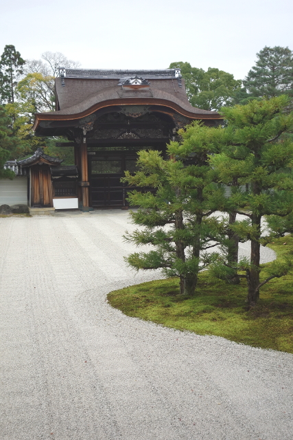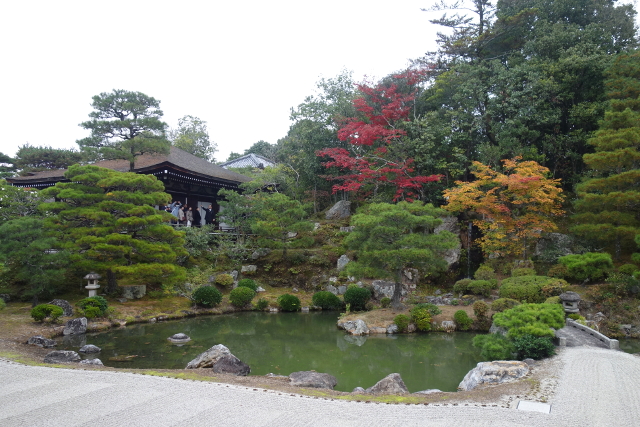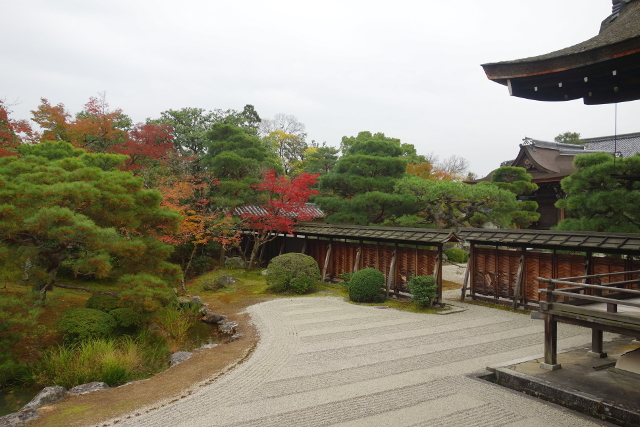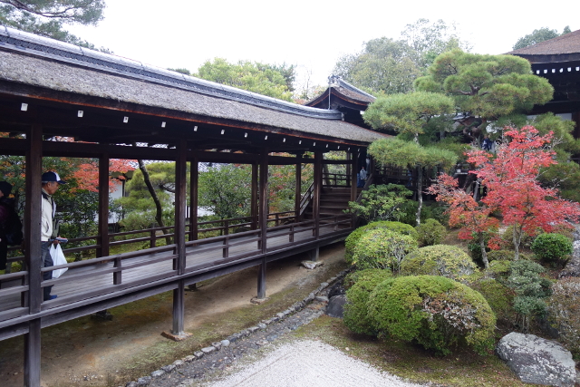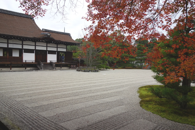 天際的微雨如絮輕落,廊簷雖擋去衣衫可能的溼漉,帶著水氣的沁冷卻已漸包圍上來。我站在敞廊朝「北庭」望,從這方向能見「宸殿」褐簷折挑,淨白沙地上楓紅灼豔。然當如此凝視,腦中也浮現一幅畫面,是個在殿裡踽踽獨行的老者,儘管衣裝素簡,舉止卻透著貴氣。我不禁想著為何諸多天皇在退位後選擇遁入空門,僅是依循傳統?還是真的想尋求佛理?畢竟我們尋常百姓到了終暮,希冀的皆是與子孫、與摯愛之人,在個清雅居所讓溫情燃盡生命餘火。