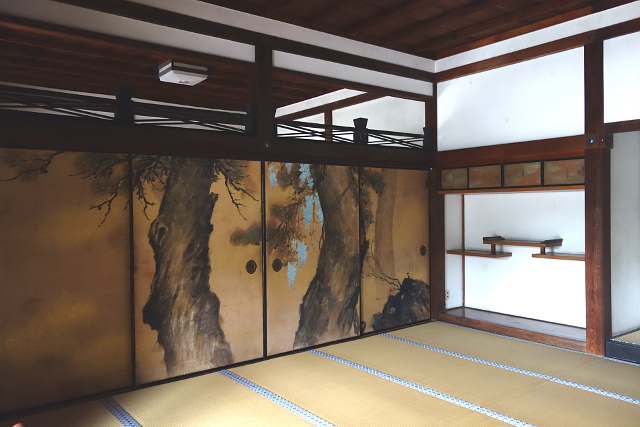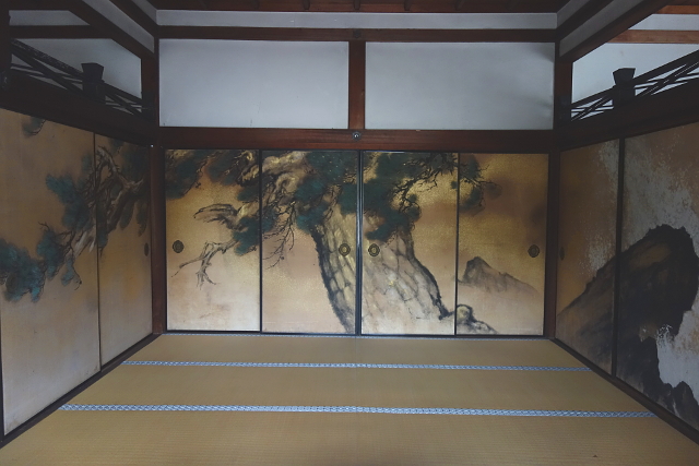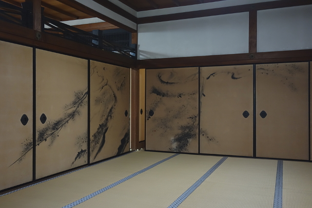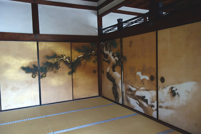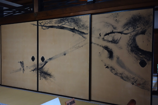 仔細端詳過後,我從火豔矮楓旁飾的「表門」穿了進去,來到有唐破風勾曲的御殿入口,將鞋脫置在一旁櫃架,順著門廊先走至「白書院」。它的背側有個被寺務房舍抱擁的小苔庭,散植著葉形各異的不同樹種,雖也有幾點楓紅,但枝展疏落,只能算是旁襯的存在。「白書院」本身則清雅,多數居間的襖繪皆以蒼松妝點,有的覆染冬雪,能見白羽翩舞應和,有的以勁偉主幹為視覺焦點,綴連飛瀑巨岩便勾出嶔崎山色。